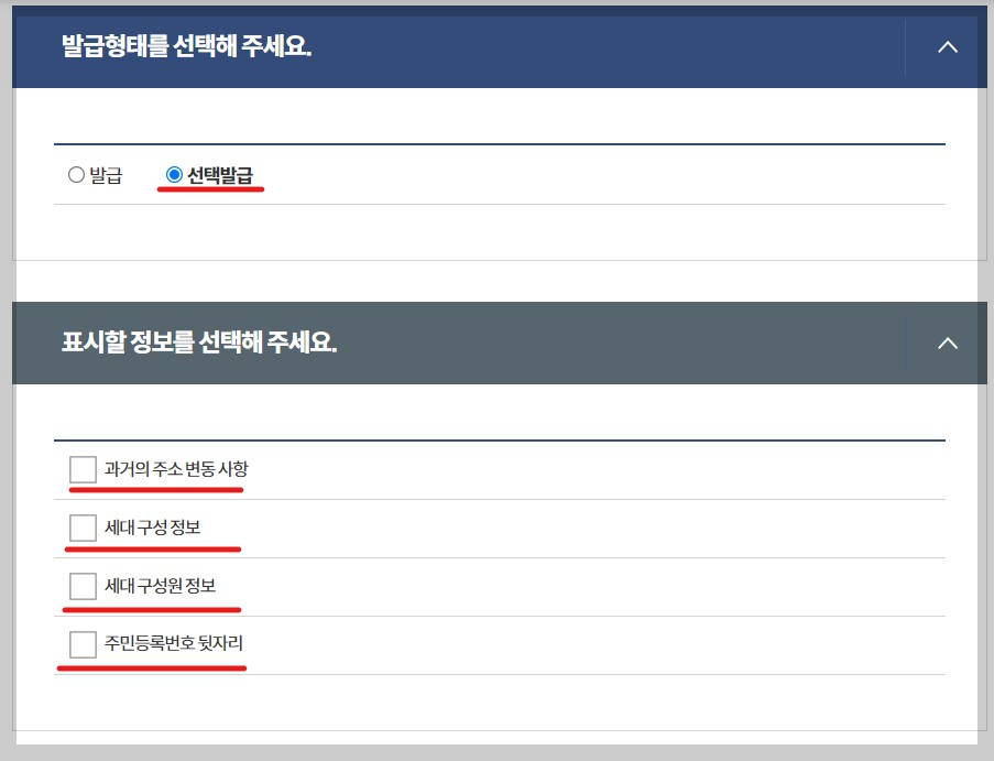 인증을 받으셨다면, 등본에 표기될 내용을 확인하는 단계로 넘어갑니다. 정보를 선택하여 발급받으실 수 있습니다. 우선 주민등록상의 주소와 발급 형태를, 표시 정보, 수령 방법을 선택하시길 바랍니다. 그 이후 등본에 표기되었으면 하는 정보를 선택하시면 됩니다. 주민등록등본 선택 정보는 과거 주소 변동 사황 및 세대구성 정보, 구성원 정보, 주민등록번호 뒷자리 표기 등이 있습니다.