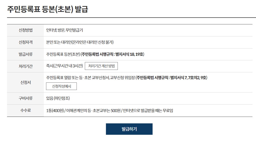 주민등록등본 발급 페이지에서 '발급하기' 버튼을 클릭하면 발급 메뉴로 이동합니다. 주민센터를 방문하여 직접 발급받을 경우, 1통당 400원의 수수료가 부과되지만, 인터넷을 통해 주민등록등본을 발급하면 수수료가 없습니다. 또한 즉시 처리되어 신속하게 발급받을 수 있습니다.