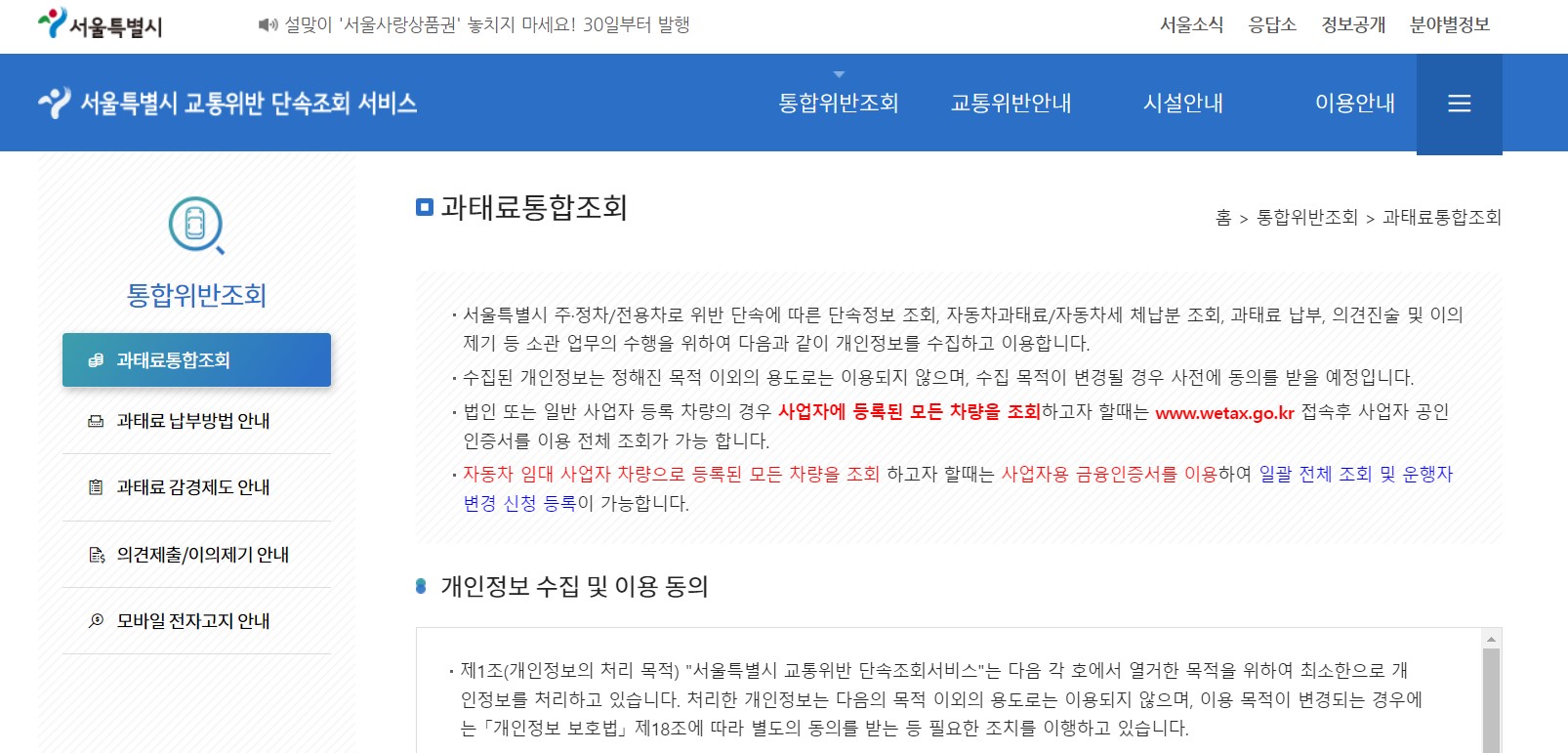 서울 지역은 카텍스를, 그 외 지역은 위택스를 홈페이지에서 과태료 조회를 하실 수 있습니다.